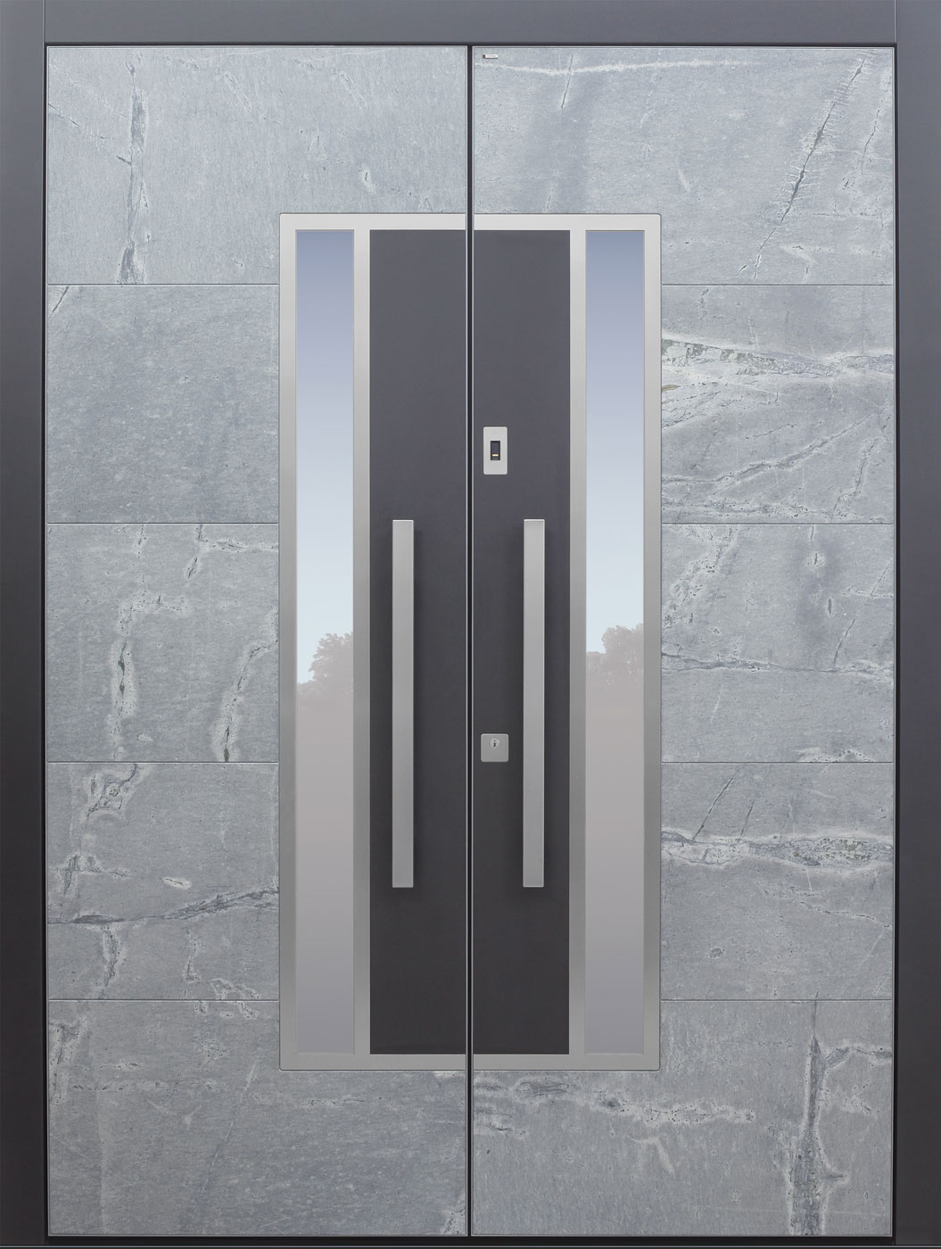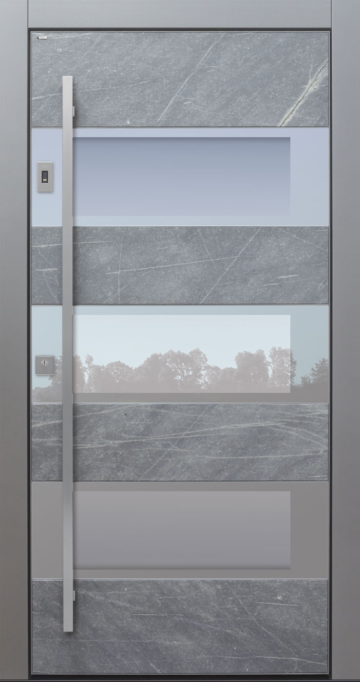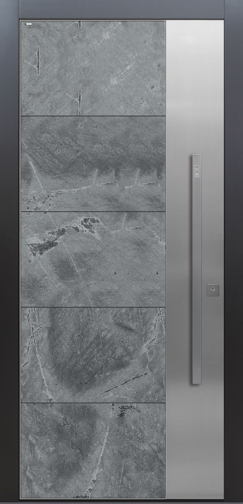 Faserverstärkte Betonplatten garantieren eine absolut wartungsfreie und extrem widerstandsfähige Oberfläche. Jede Betonoberfläche ist ein Unikat und wird in eigens angefertigten, nur einmal verwendeten, Formen abgegossen – daher gleicht kein Modell dem anderen! Dabei auftretende Farbunterschiede oder Strukturabweichungen geben der Tür ihren besonderen Charakter.